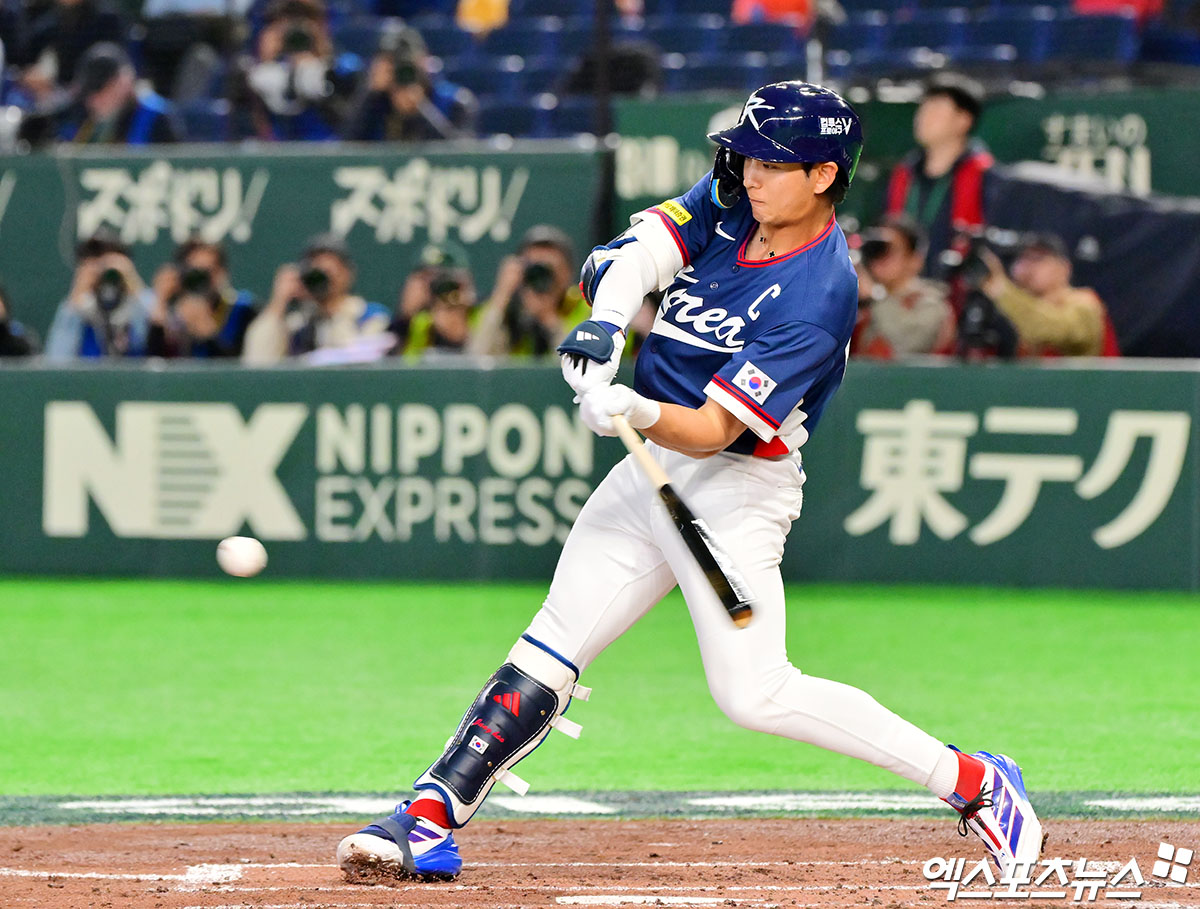 (엑스포츠뉴스 도쿄(일본), 김한준 기자) 9일 오후 일본 도쿄돔에서 열린 2026 월드베이스볼클래식(WBC) C조 한국과 호주의 경기, 3회초 무사 2루 한국 이정후가 1타점 2루타를 날리고 있다.