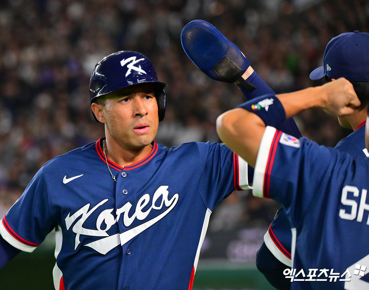 (엑스포츠뉴스 도쿄(일본), 김한준 기자) 9일 오후 일본 도쿄돔에서 열린 2026 월드베이스볼클래식(WBC) C조 한국과 호주의 경기, 3회초 무사 2루 한국 저메이 존스가 이정후의 1타점 2루타때 득점에 성공하고 있다.