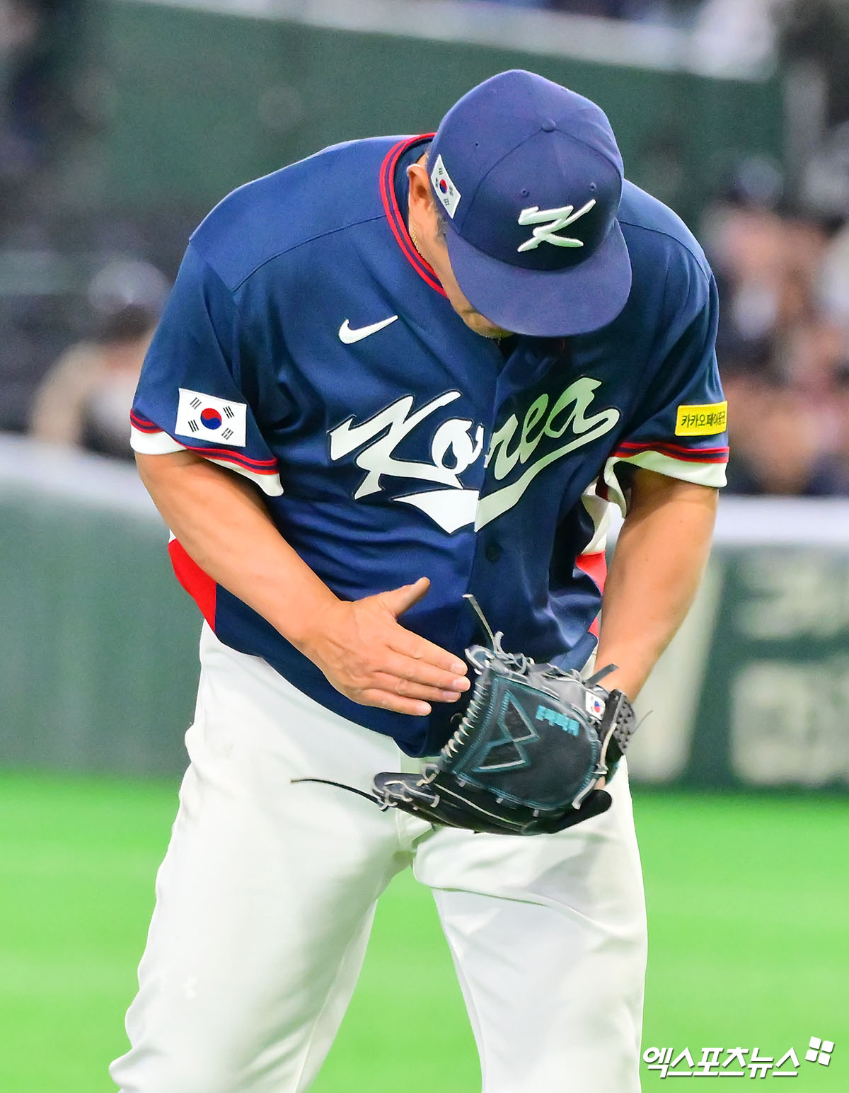 (엑스포츠뉴스 도쿄(일본), 김한준 기자) 9일 오후 일본 도쿄돔에서 열린 2026 월드베이스볼클래식(WBC) C조 한국과 호주의 경기, 3회말 수비를 마친 한국 노경은이 기뻐하고 있다.