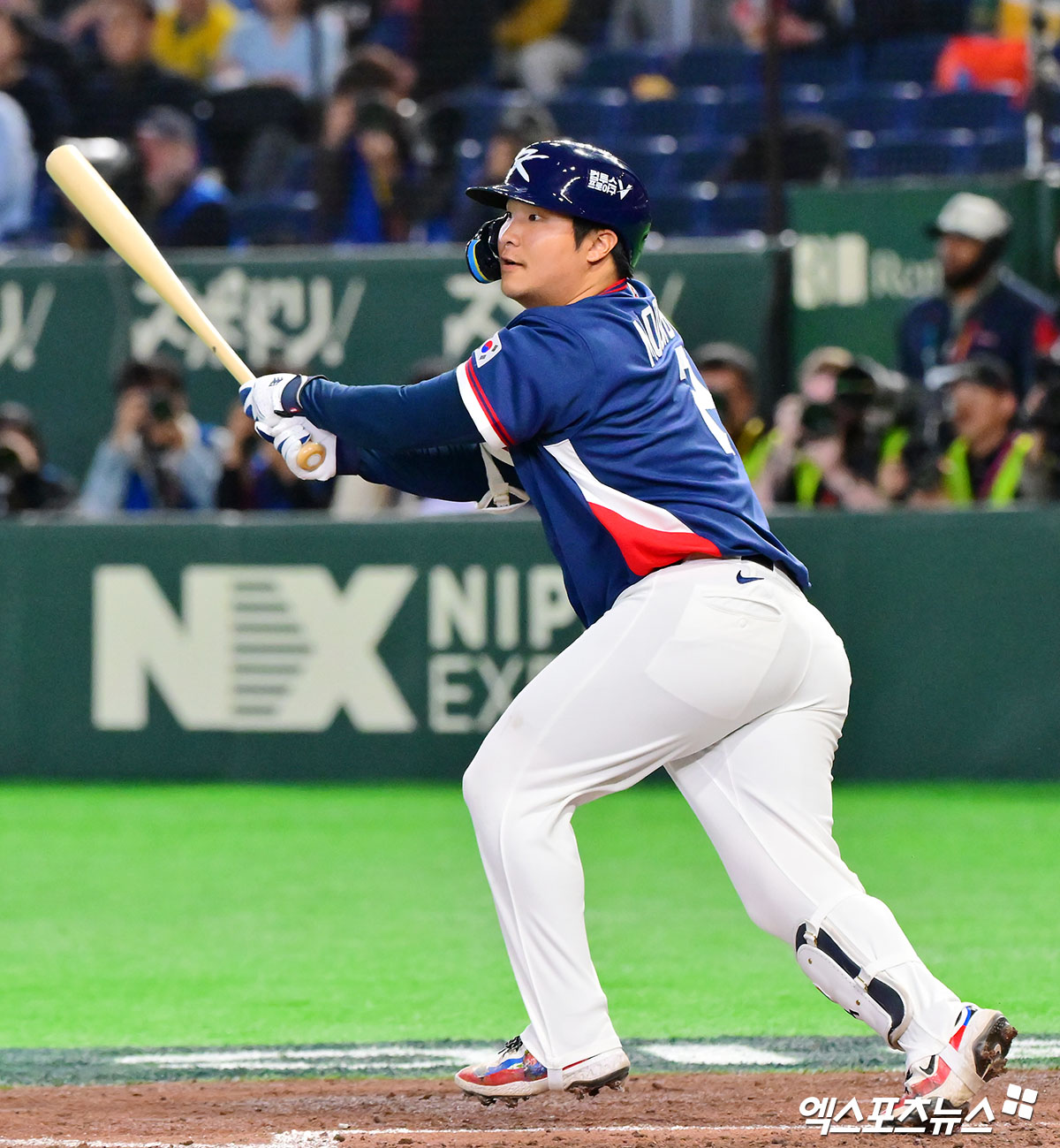 (엑스포츠뉴스 도쿄(일본), 김한준 기자) 9일 오후 일본 도쿄돔에서 열린 2026 월드베이스볼클래식(WBC) C조 한국과 호주의 경기, 5회초 2사 2루 한국 문보경이 1타점 적시타를 날리고 있다.