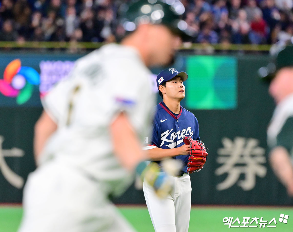 (엑스포츠뉴스 도쿄(일본), 김한준 기자) 9일 오후 일본 도쿄돔에서 열린 2026 월드베이스볼클래식(WBC) C조 한국과 호주의 경기, 5회말 한국 소형준이 호주 그렌디닝에게 홈런을 허용한 후 아쉬워하고 있다.