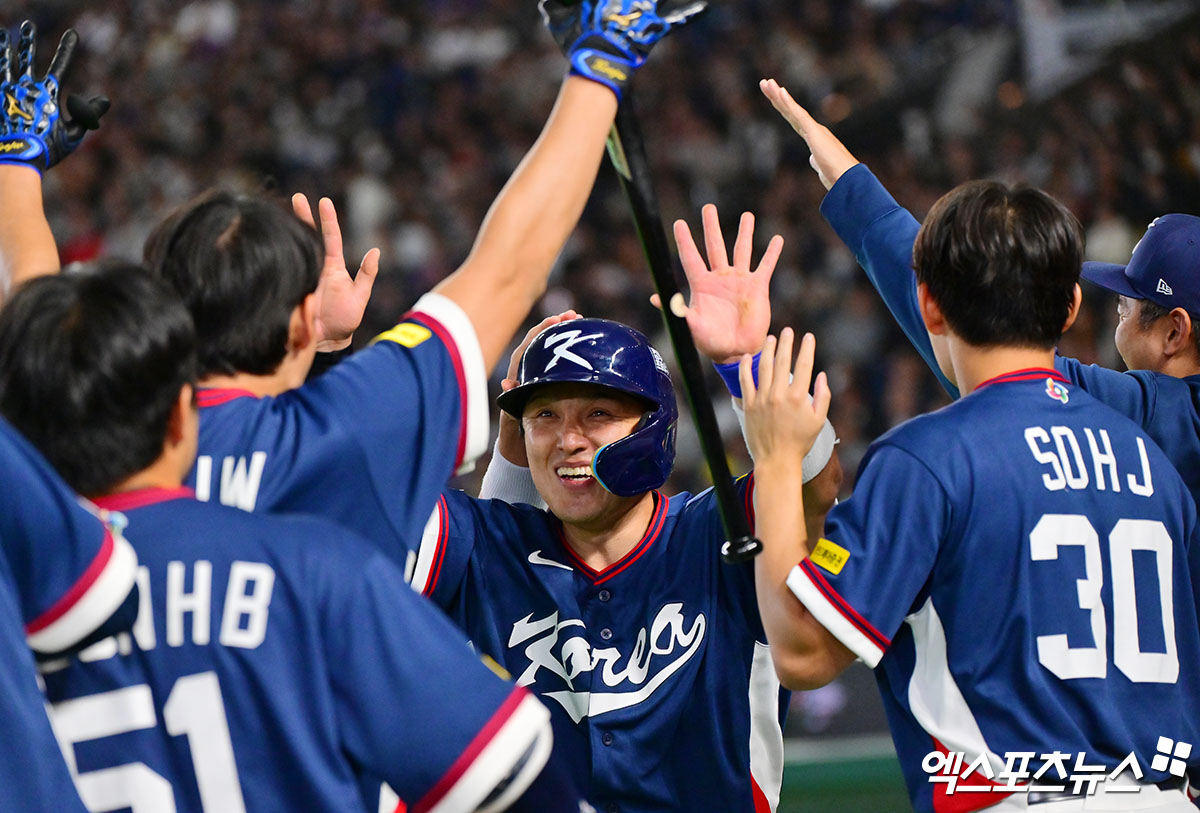 (엑스포츠뉴스 도쿄(일본), 김한준 기자) 9일 오후 일본 도쿄돔에서 열린 2026 월드베이스볼클래식(WBC) C조 한국과 호주의 경기, 6회초 2사 3루 한국 박동원이 김도영의 1타점 적시타때 득점에 성공하고 있다.