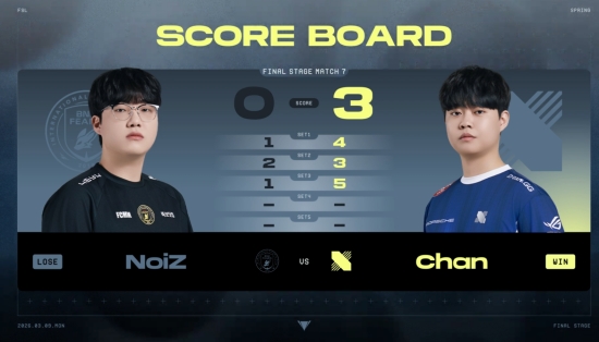 70분에 4대1로 격차를 벌린 Chan. 격차를 좁히기엔 NoiZ에게 주어진 시간은 부족했고, Chan은 자축포까지 쏘아 올리며 전후반 5대1로 경기를 마무리했다. 그리고 이 경기를 통해 세트스코어 3대0 승리를 확정하고 결승전에 한층 더 가까이 다가섰다.