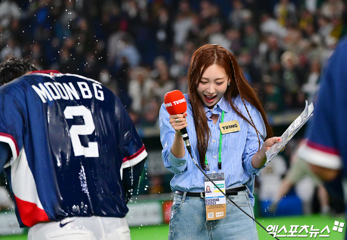 한국 문보경과 박지영 아나운서가 물세례를 맞고 있다.