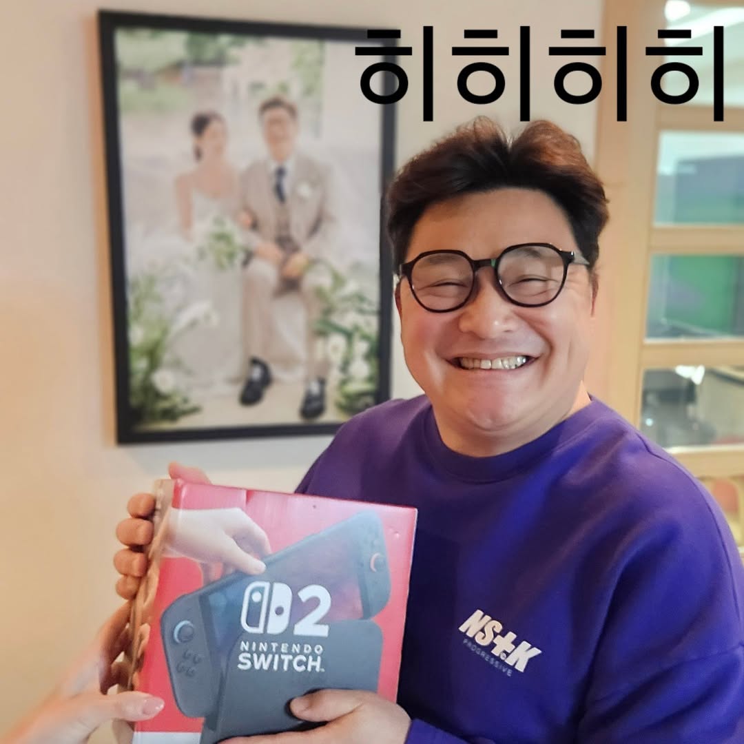 윤정수는 "장고 끝에 결정해서 사 준 아내의 늦은 생일 선물 닌텐도2. 여봉... 훌륭한 마리오 카트 선수가 될게요!"라며 아내 원진서의 게임기 선물을 자랑했다.