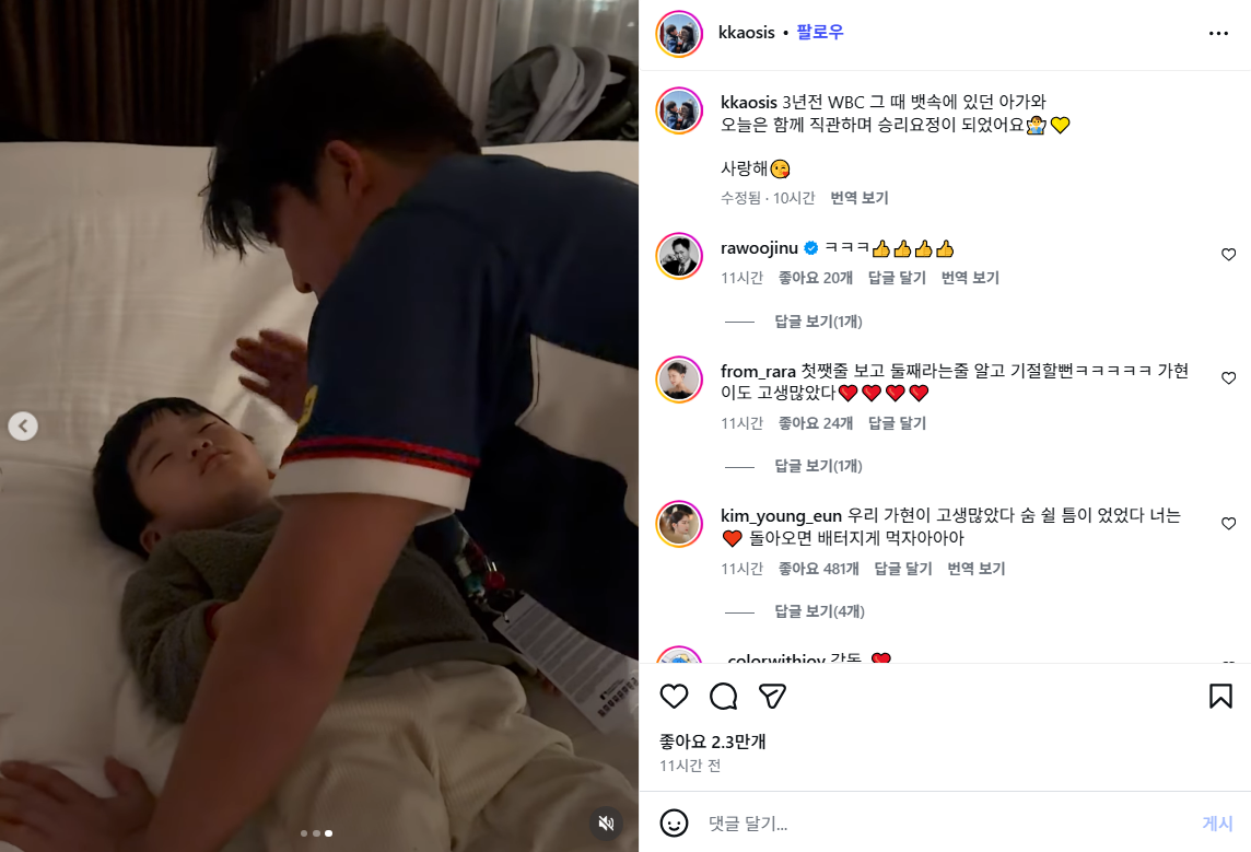 이날 승리 직후 팬들 사이에서는 또 하나의 특별한 이야기가 전해졌다. 고우석의 아내가 자신의 인스타그램을 통해 남긴 글 때문이다. 그는 경기 직후 인스타그램에 남편과 아들의 사진을 함께 올리며 "3년 전 그때 뱃속에 있었던 아가와 오늘은 함께 직관하며 승리 요정이 됐다"는 메시지를 남겼다. 직전 대회인 2023년 WBC에서 한국은 호주와의 1차전에서 패해 탈락했다.