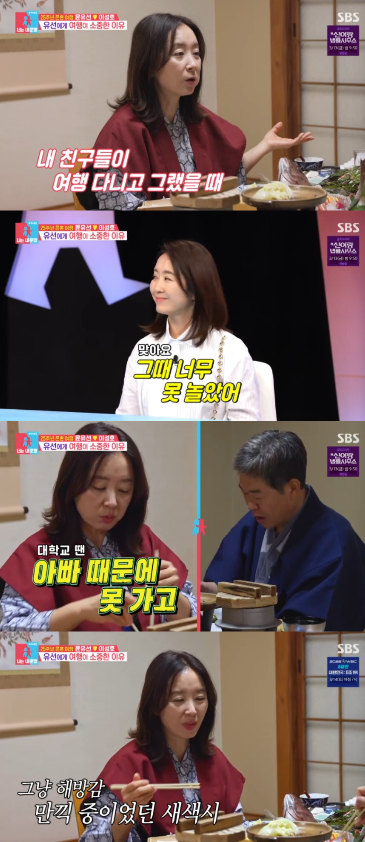 윤유선은 "결혼 전에는 뭘해도 아빠의 허락을 받았어야 했다. 그런데 결혼을 하니까 그러지 않아도 됐고, 거기에 남편이 바빠서 늦게 들어오니까 자유시간이 많아서 더 좋았다"고 말해 웃음을 줬다.