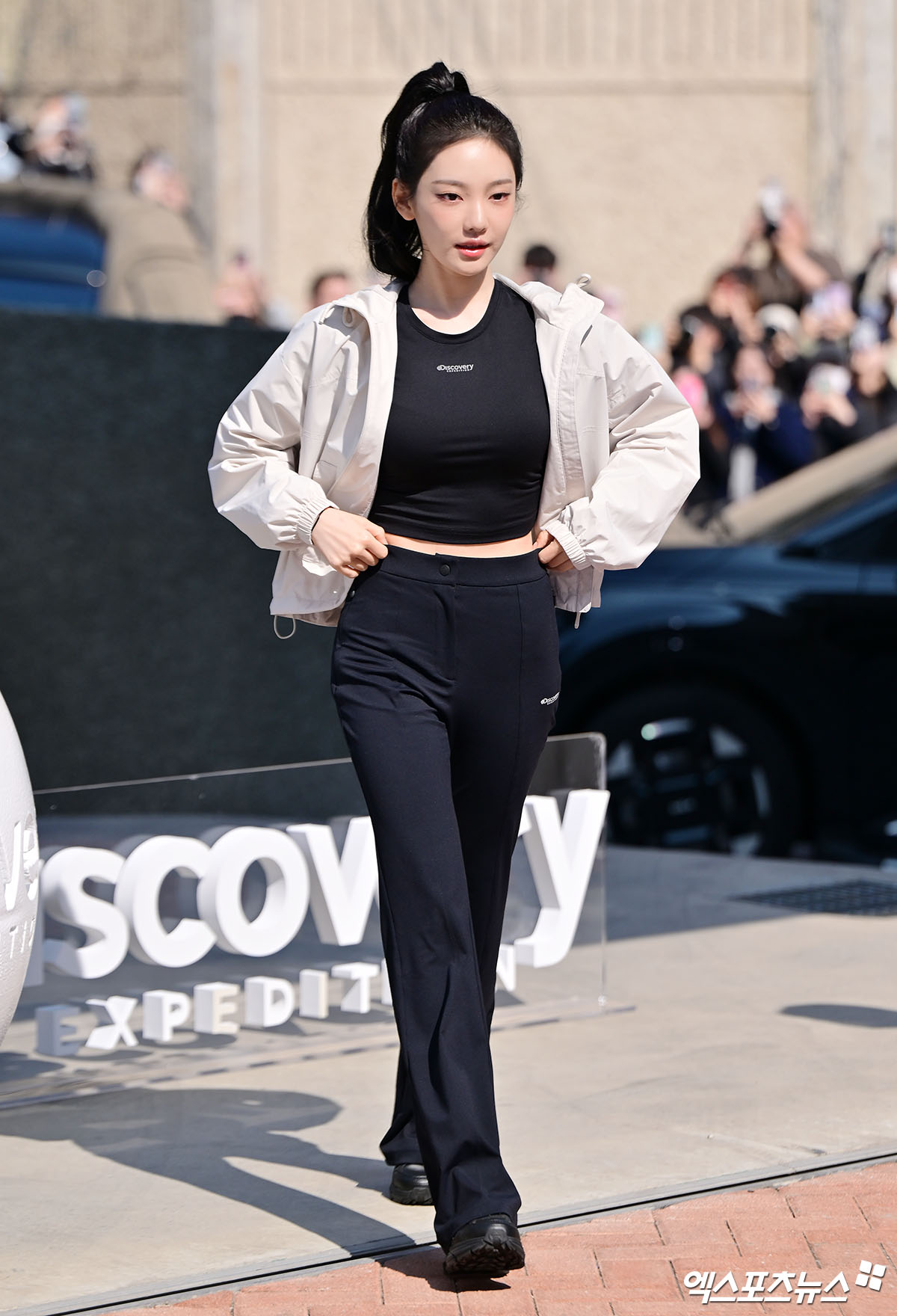 12일 오전 서울 한남동에서 ‘액티브 웰니스 라이프스타일' 포토콜 행사에 참석한 에스파 닝닝은 블랙 애슬레저 부츠컷 팬츠에 아웃도어 크롭 재킷을 매치해 등장했다.