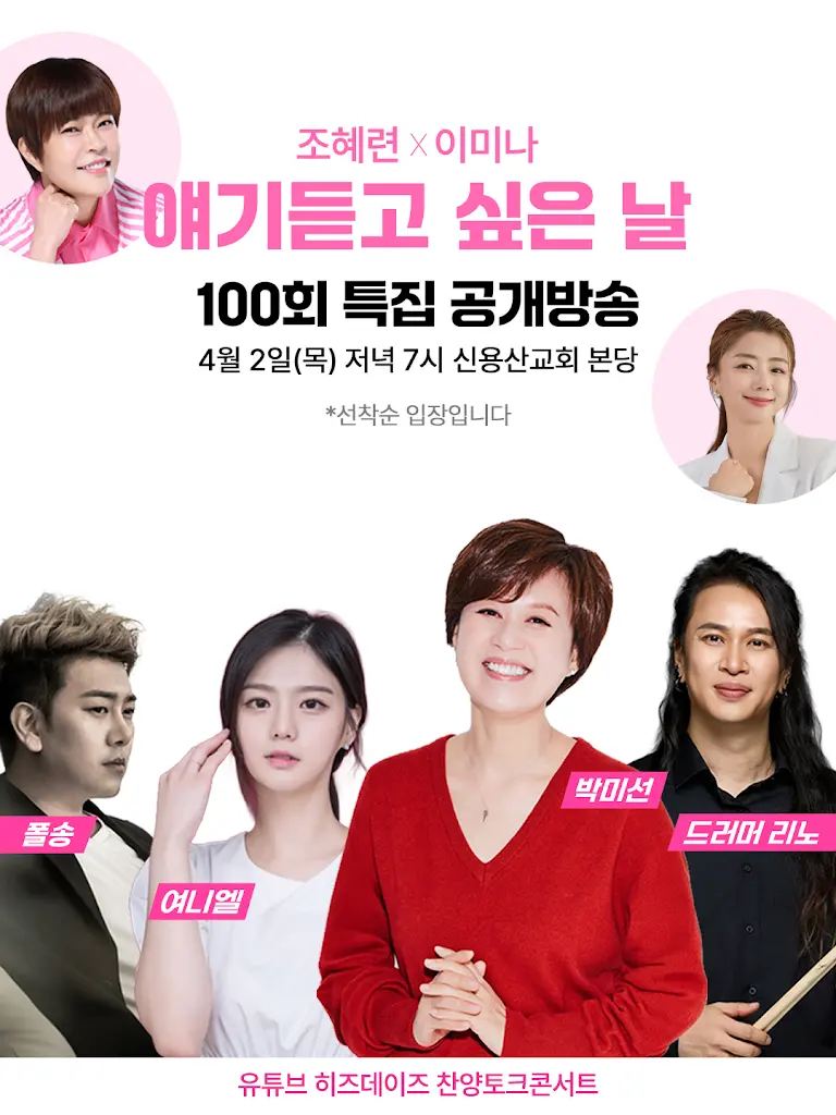 오는 4월 2일 오후 9시 신용산교회 본당에서 진행되는 공개방송에는 개그우먼 박미선과 가수 폴송, 여니엘 그리고 드러머 리노가 게스트로 나선다.