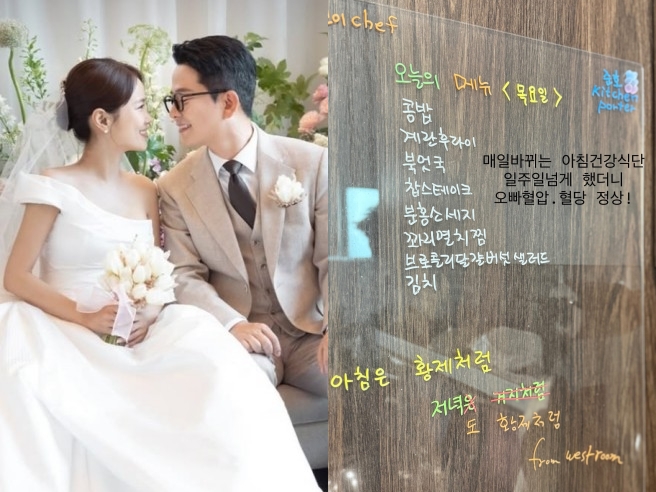 공개된 사진에는 콩밥부터 계란프라이, 북엇국, 촙스테이크, 분홍소시지, 꽈리멸치찜, 브로콜리달걀버섯샐러드, 김치로 차려진 아침상이 담겨 있어 눈길을 끈다.