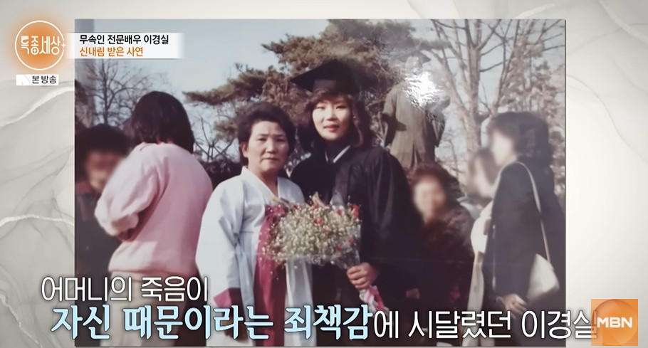 이경실은 "내 생일 챙겨준다고 장보러 가시다가, 횡단보도에서 버스에 치여 돌아가셨다. 돌아가신 장소에서 넋을 기리는 굿을 하는데, 거기 있던 무당이 나 때문에 우리 엄마가 죽었다고 하더라"고 밝혔다.