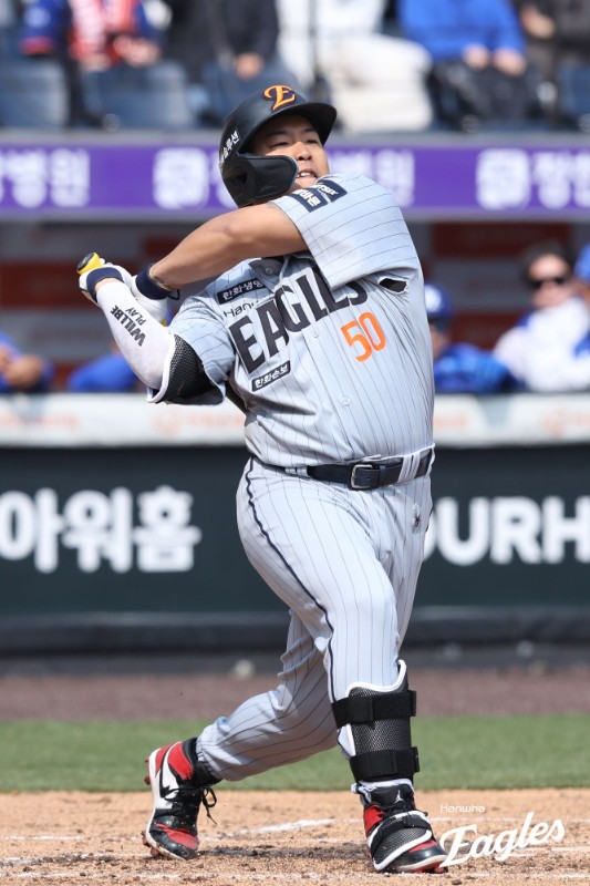 '100억 거포' 강백호가 한화 이글스 유니폼을 입고 대전 홈 팬들 앞에서 첫 홈런포를 쏘아 올렸다. 강백호는 13일 대전 한화생명 볼파크에서 열린 2026 KBO 시범경기에 3번 지명타자로 선발출전, 삼성 라이온즈를 상대로 홈런을 기록했다. 강백호는 이날 1회말 첫 타석은 중견수 뜬공, 4회말 두 번째 타석은 헛스윙 삼진으로 물러났다. 지난 12일 시범경기 개막전에서 3타수 1안타로 나쁘지 않은 타격감을 보여줬던 가운데 이튿날에는 게임 초반 방망이가 힘차게 돌지 않았다. 그러나 세 번째 타석에서 침묵을 깼다. 한화가 2-2로 팽팽하게 맞선 6회말 선두타자로 나와 삼성 우완 이승현을 상대로 우측 담장 넘어가는 솔로 홈런을 터트렸다. 한화 이글스