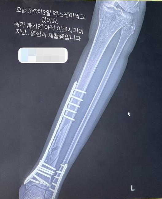 지난 12일 엄지원이 자신의 SNS에 엑스레이 사진을 공유했다. 엄지은 "오늘 3주차3일 엑스레이 찍고 왔어요. 뼈가 붙기엔 아직 이른시기지만... 열심히 재활중입니다"라는 멘트와 함께 재활 사실을 알렸다.