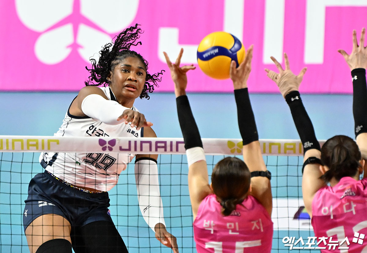 (엑스포츠뉴스 인천, 김한준 기자) 13일 오후 인천 부평구 삼산월드체육관 열린 '진에어 2025-2026 V-리그' 흥국생명과 한국도로공사의 경기, 도로공사 모마가 공격을 시도하고 있다.