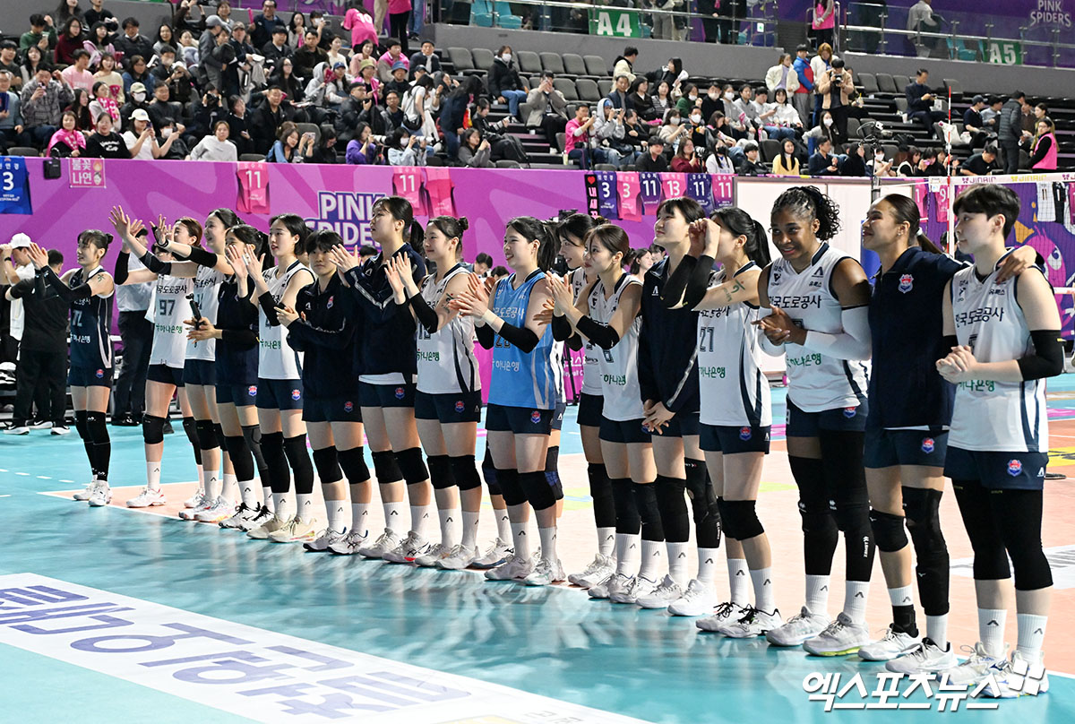 (엑스포츠뉴스 인천, 김한준 기자) 13일 오후 인천 부평구 삼산월드체육관 열린 '진에어 2025-2026 V-리그' 흥국생명과 한국도로공사의 경기, 한국도로공사가 흥국생명에 세트스코어 3:0(25-19 27-25 25-17)으로 승리하며 정규리그 우승을 확정했다.