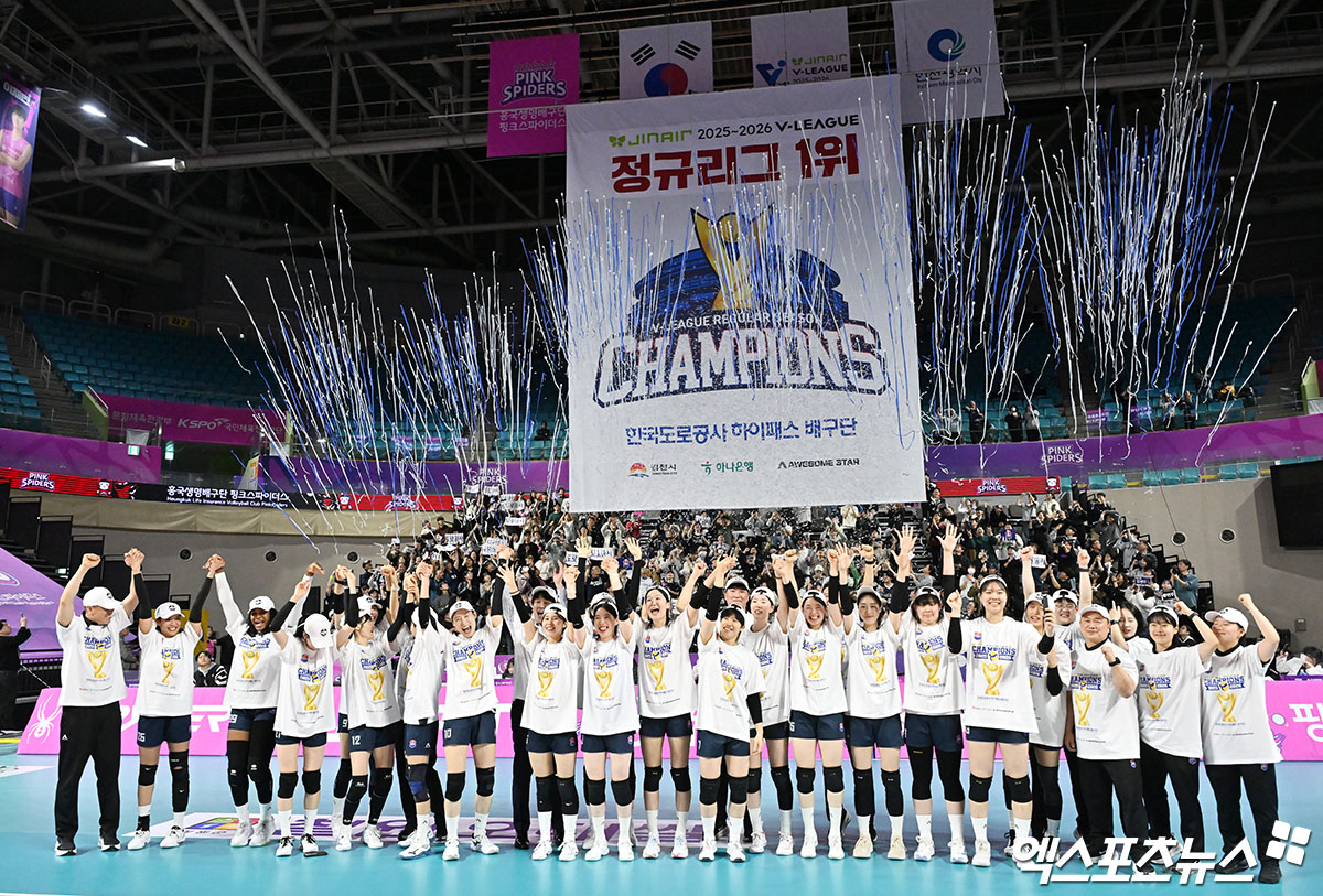 (엑스포츠뉴스 인천, 김한준 기자) 13일 오후 인천 부평구 삼산월드체육관 열린 '진에어 2025-2026 V-리그' 흥국생명과 한국도로공사의 경기, 한국도로공사가 흥국생명에 세트스코어 3:0(25-19 27-25 25-17)으로 승리하며 정규리그 우승을 확정했다.