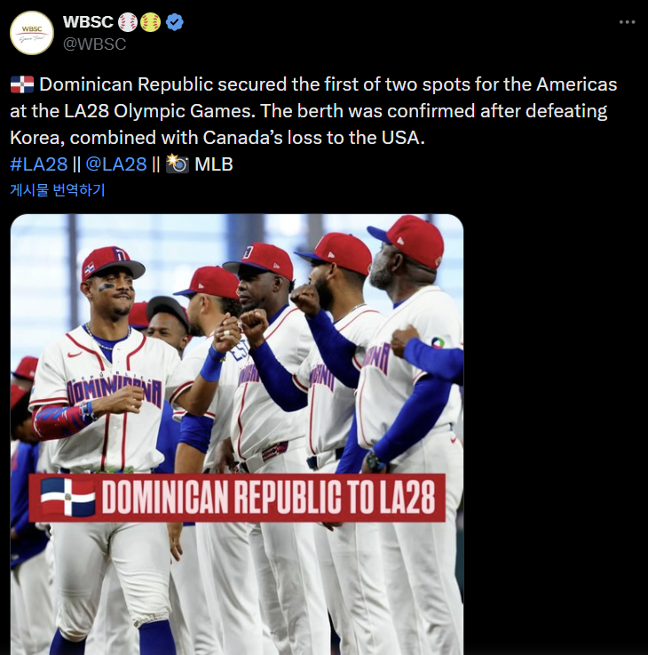 LA 올림픽 야구 종목엔 총 6개국이 오른다. 미국, 도미니카공화국 외에 이번 WBC에서 아메리카 대륙 중 상위 2위 안에 드는 나머지 한 팀이 본선 출전권을 따낸다.