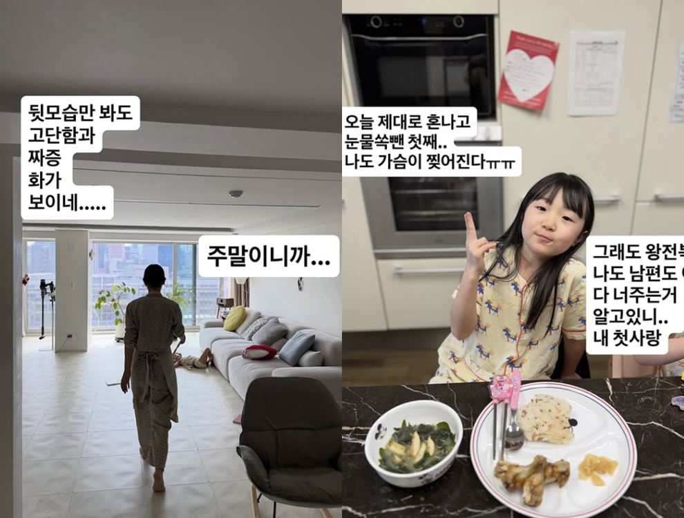 공개된 사진 속에는 두 가지 요리를 동시에 하는 이지혜의 일상, 울며 떼쓰는 딸 태리의 모습 등이 담겼다. 그는 "뒷모습만 봐도 고단함과 짜증, 화가 보이네. 주말이니까.."라며 풍경 좋은 집안에서 힘겨운 뒷모습으로 걸어다니는 자신의 모습이 담긴 사진도 업로드했다.