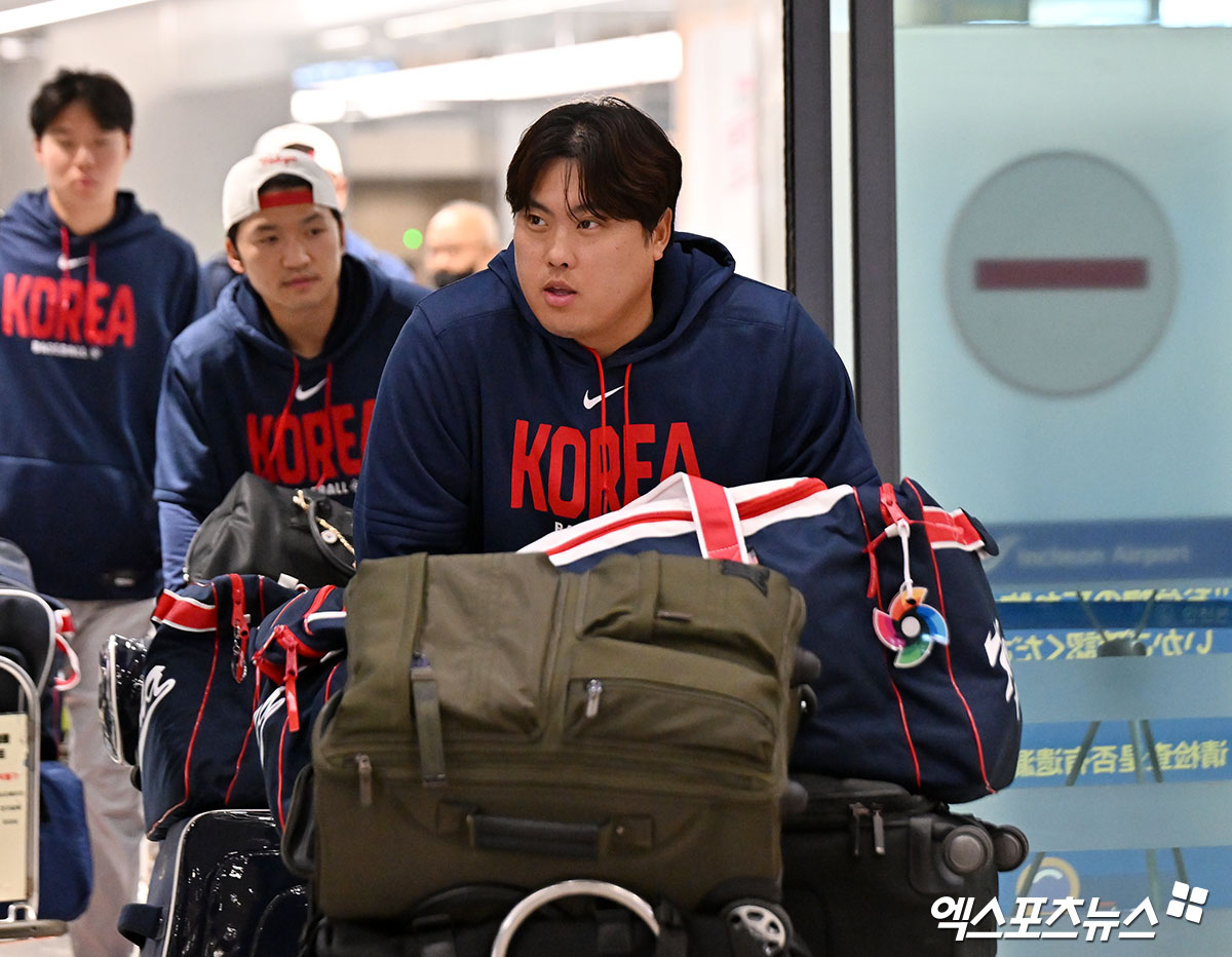입국장을 빠져나오는 야구 대표팀 류현진.