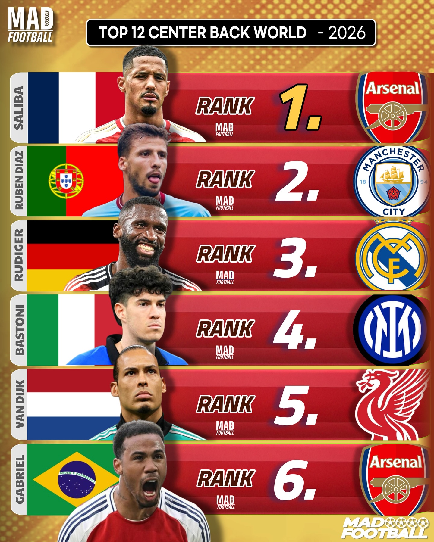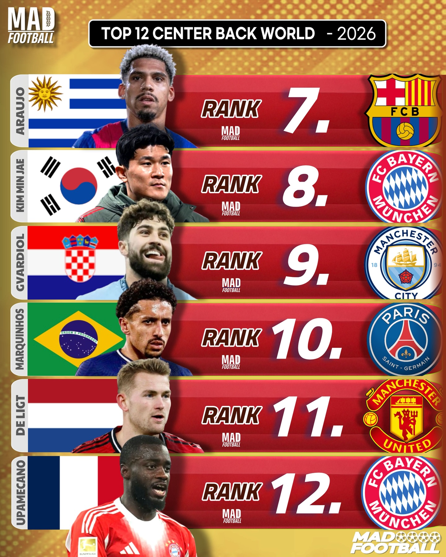 글로벌 축구 콘텐츠 매체 '매드 풋볼'은 15일(한국시간) 2025-2026시즌 현재 세계 최고의 센터백 상위 12명을 선정해 발표했다.