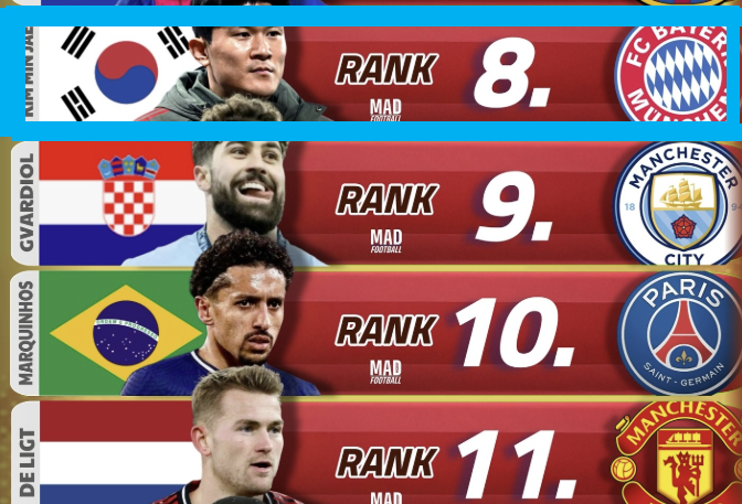 놀라운 점은 현재 뮌헨 주전 수비수인 다요 우파메카노(프랑스)가 김민재보다 낮은 12위에 머물렀다는 점이다.