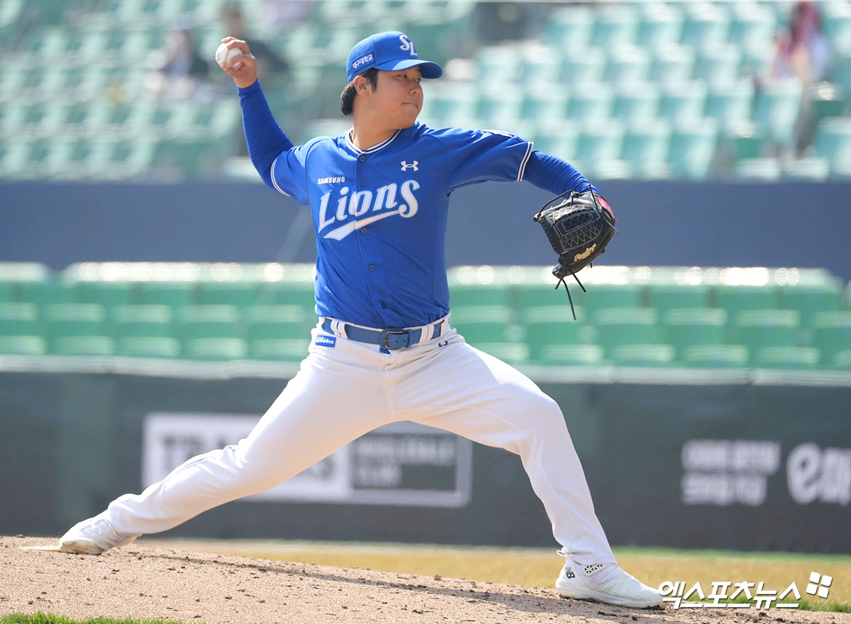 (엑스포츠뉴스 인천, 고아라 기자) 17일 오후 인천SSG랜더스필드에서 열린 ‘2026 신한 SOL KBO리그’ 삼성 라이온즈와 SSG 랜더스의 시범경기, 5회말 삼성 정민성이 공을 힘차게 던지고 있다.