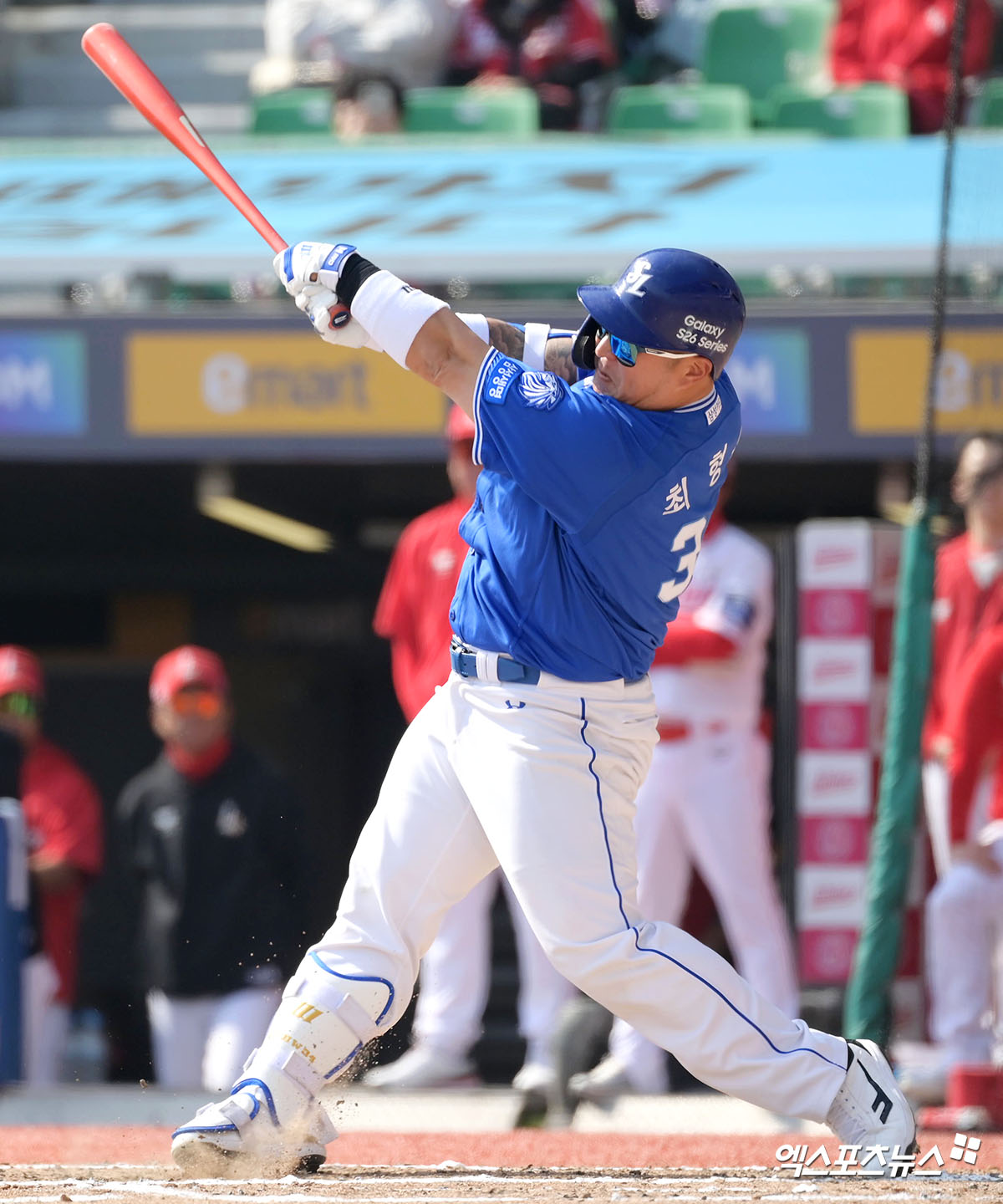 (엑스포츠뉴스 인천, 고아라 기자) 17일 오후 인천SSG랜더스필드에서 열린 ‘2026 신한 SOL KBO리그’ 삼성 라이온즈와 SSG 랜더스의 시범경기, 6회초 무사 1루 삼성 최형우가 타격하고 있다.