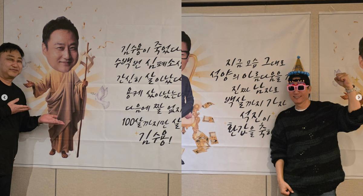 '환갑잔치 현수막'과 포즈를 취하는 김수용, 지석진의 모습도 눈길을 끌었다. 특히 김수용의 현수막에는 '김수용이 죽었다며? 수백 번 심폐소생하고 간신히 살아났다며? 용케 살아났는데 다음에 짤 없지? 100살까지만 살자 김수용'이라는 문구가 담겼다.