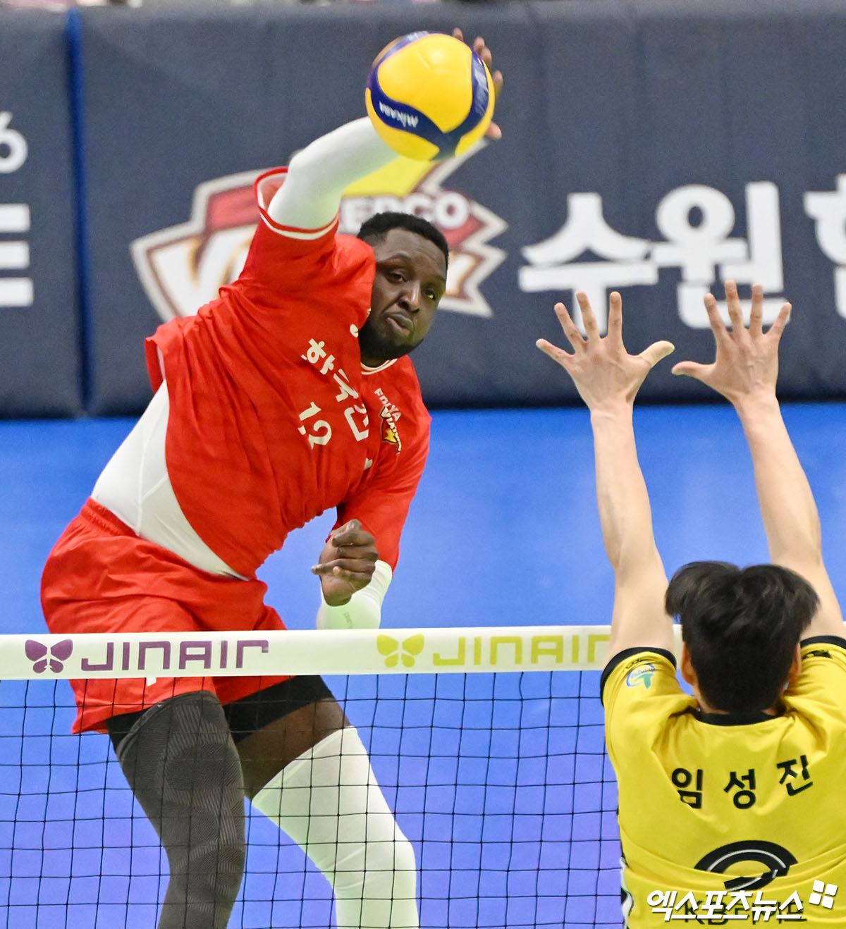 (엑스포츠뉴스 수원, 김한준 기자) 18일 오후 경기도 수원실내체육관에서 열린 '진에어 2025-2026 V-리그' 한국전력과 KB손해보험의 경기, 한국전력 베논이 공격을 시도하고 있다.