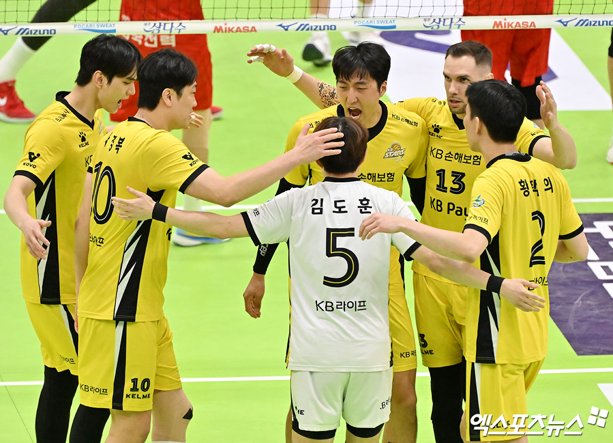 (엑스포츠뉴스 수원, 김한준 기자) 18일 오후 경기도 수원실내체육관에서 열린 '진에어 2025-2026 V-리그' 한국전력과 KB손해보험의 경기, KB손해보험 선수들이 기뻐하고 있다.