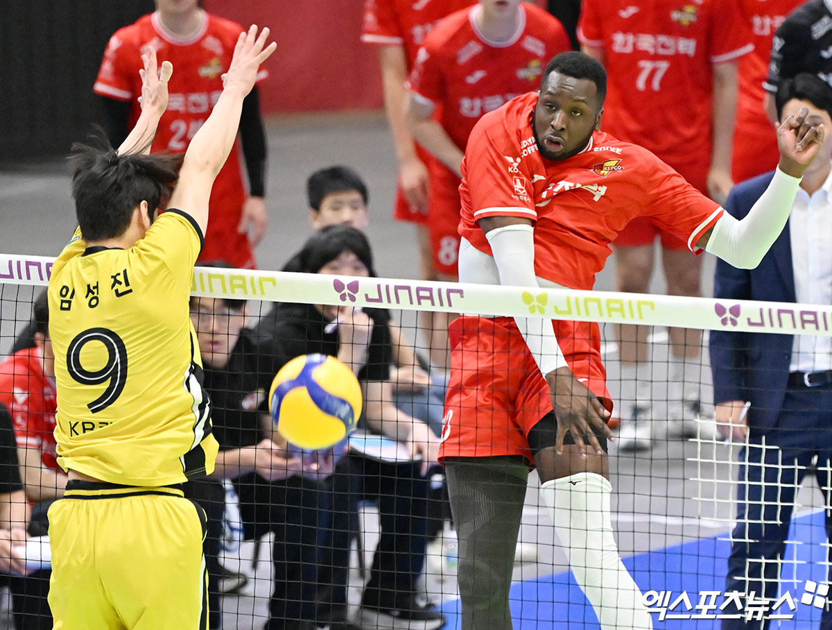 (엑스포츠뉴스 수원, 김한준 기자) 18일 오후 경기도 수원실내체육관에서 열린 '진에어 2025-2026 V-리그' 한국전력과 KB손해보험의 경기, 한국전력 베논이 공격을 시도하고 있다.
