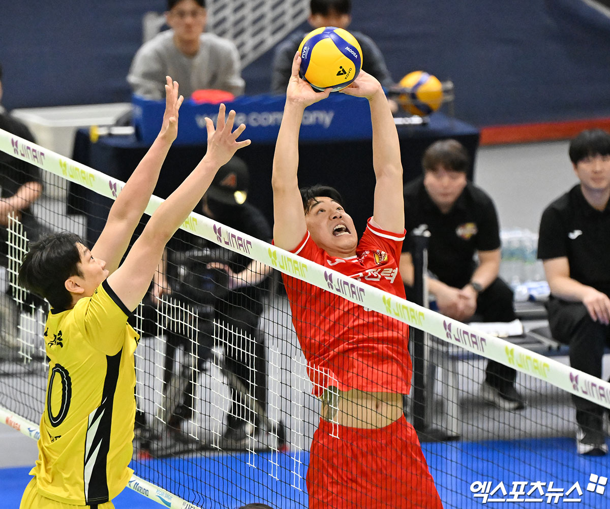 (엑스포츠뉴스 수원, 김한준 기자) 18일 오후 경기도 수원실내체육관에서 열린 '진에어 2025-2026 V-리그' 한국전력과 KB손해보험의 경기, 한국전력 하승우가 토스를 하고 있다.