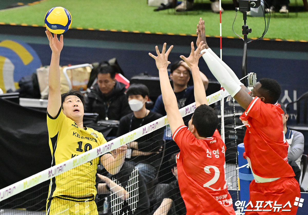 (엑스포츠뉴스 수원, 김한준 기자) 18일 오후 경기도 수원실내체육관에서 열린 '진에어 2025-2026 V-리그' 한국전력과 KB손해보험의 경기, KB손해보험 나경복이 공격을 시도하고 있다.