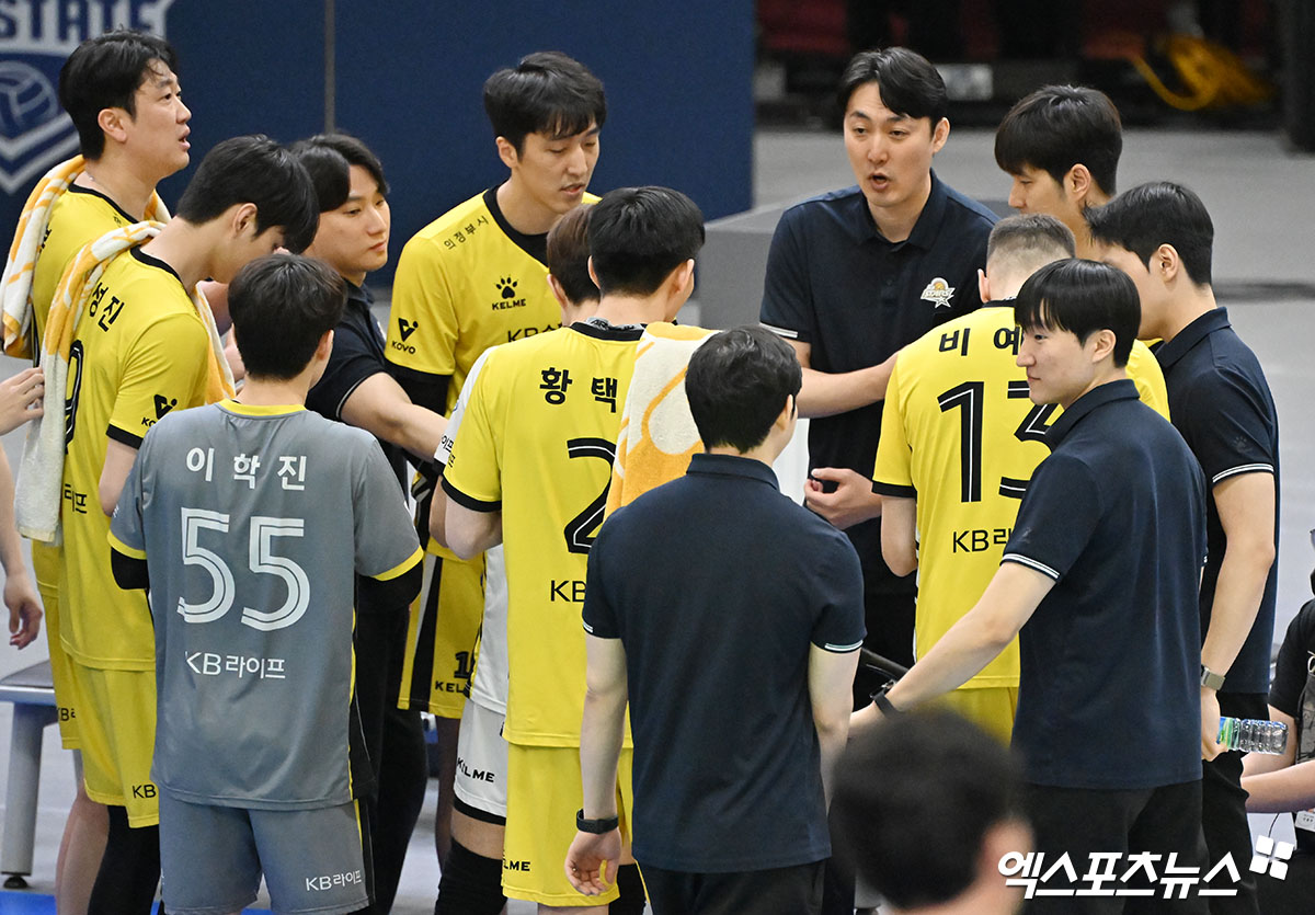 (엑스포츠뉴스 수원, 김한준 기자) 18일 오후 경기도 수원실내체육관에서 열린 '진에어 2025-2026 V-리그' 한국전력과 KB손해보험의 경기, KB손해보험 하현용 감독대행이 작전타임을 갖고 있다.