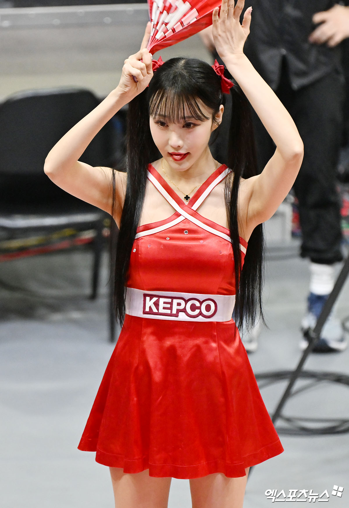 (엑스포츠뉴스 수원, 김한준 기자) 18일 오후 경기도 수원실내체육관에서 열린 '진에어 2025-2026 V-리그' 한국전력과 KB손해보험의 경기, 정가예 치어리더가 열띤 응원을 선보이고 있다.