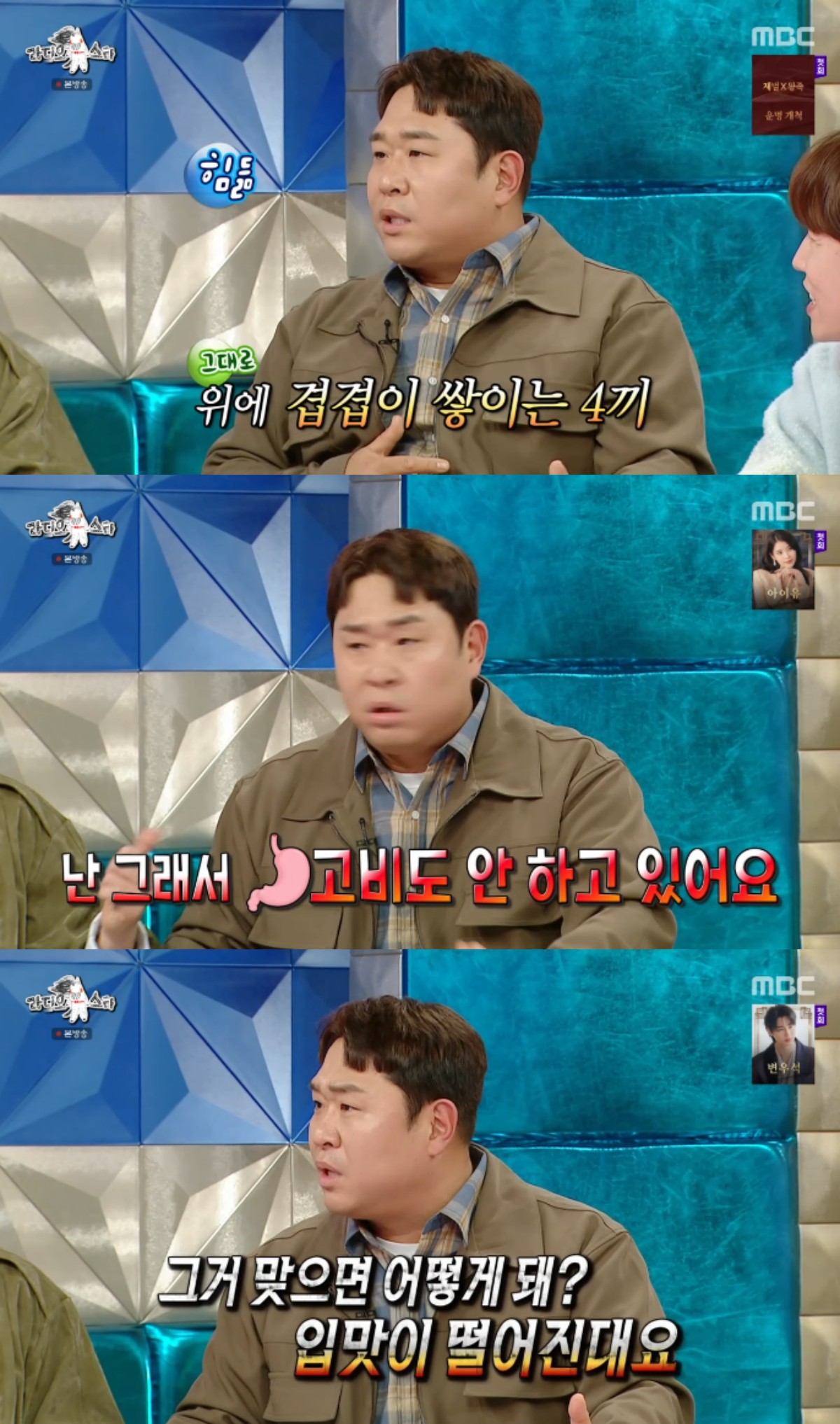 이어 "원래 매주 촬영을 했는데, 격주 촬영으로 바뀌었다. 그래서 하루에 기본 4끼를 먹어야한다. 옛날 같으면 배가 금방 꺼져야하는데, 이제는 배가 안 꺼지더라"고 속상해했다.