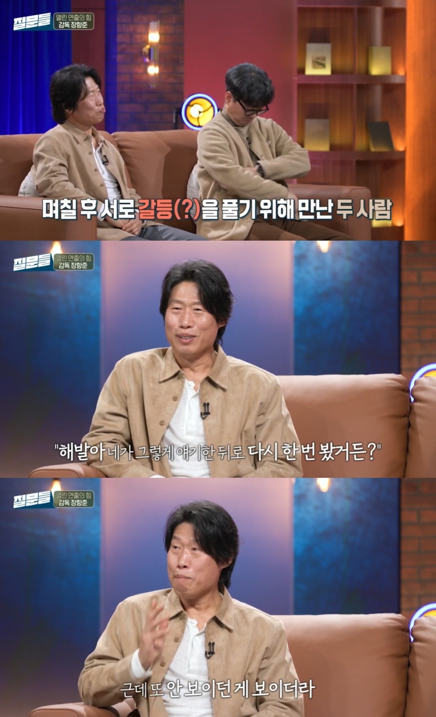 유해진은 "그 후 며칠 뒤에 서로 풀기 위해서 만났다"라고 말을 이었고, 손석희는 "실제로 두분이 살짝 그랬던 거냐"며 놀라워했다. 유해진은 "(장항준 감독은) 저를 해발이라고 한다. '해발아, 네가 그렇게 얘기한 뒤로 다시 봤거든? 근데 또 안 보이던 게 보이더라'"라며 당시 대화를 이야기했다.