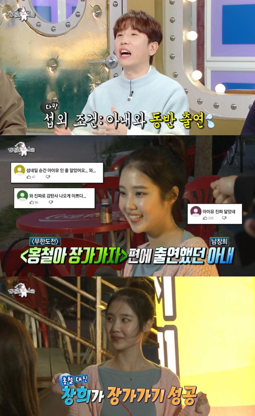 '홍철아 장가가자' 당시 짧게 등장해 아이유 닮은 꼴로 큰 화제를 모았던 남창희의 아내에 붐은 "난 좀 섭섭하다. 그런 게 있으면 친구에게 이야기하지"라고 토로했다.