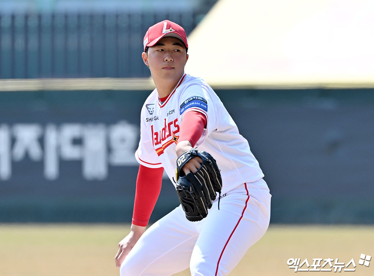 (엑스포츠뉴스 인천, 김한준 기자) 20일 오후 인천SSG랜더스필드에서 열린 '2026 신한 SOL Bank KBO리그' LG 트윈스와 SSG 랜더스의 시범경기, 1회초 SSG 선발투수 김민준이 공을 힘차게 던지고 있다.