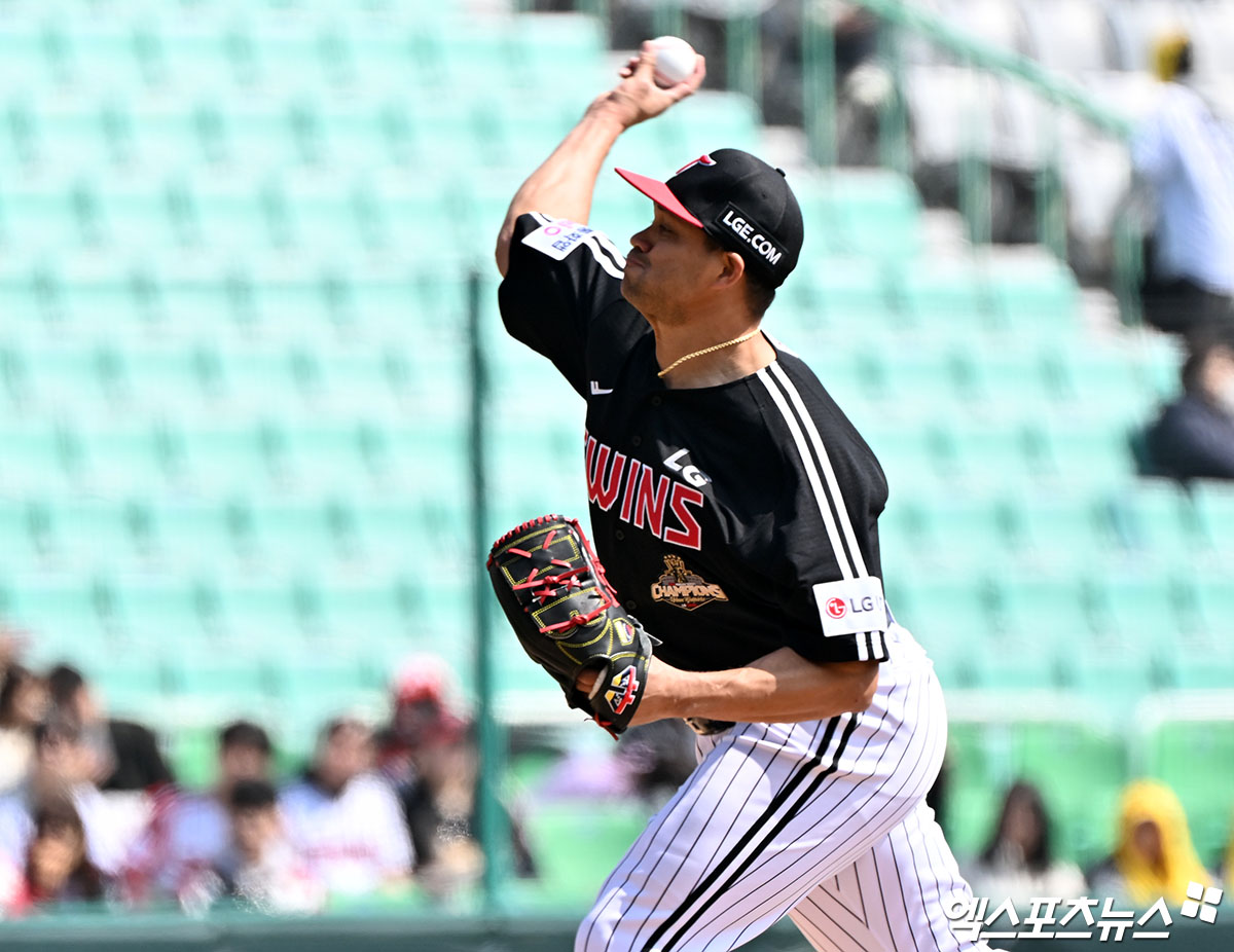 (엑스포츠뉴스 인천, 김한준 기자) 20일 오후 인천SSG랜더스필드에서 열린 '2026 신한 SOL Bank KBO리그' LG 트윈스와 SSG 랜더스의 시범경기, 1회말 LG 선발투수 치리노스가 공을 힘차게 던지고 있다.