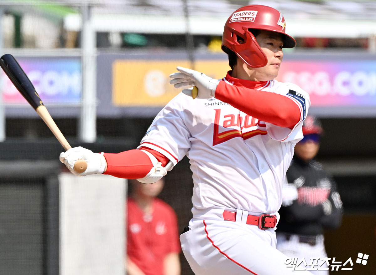 (엑스포츠뉴스 인천, 김한준 기자) 20일 오후 인천SSG랜더스필드에서 열린 '2026 신한 SOL Bank KBO리그' LG 트윈스와 SSG 랜더스의 시범경기, 4회말 1사 SSG 김재환이 우전안타를 날리고 있다.