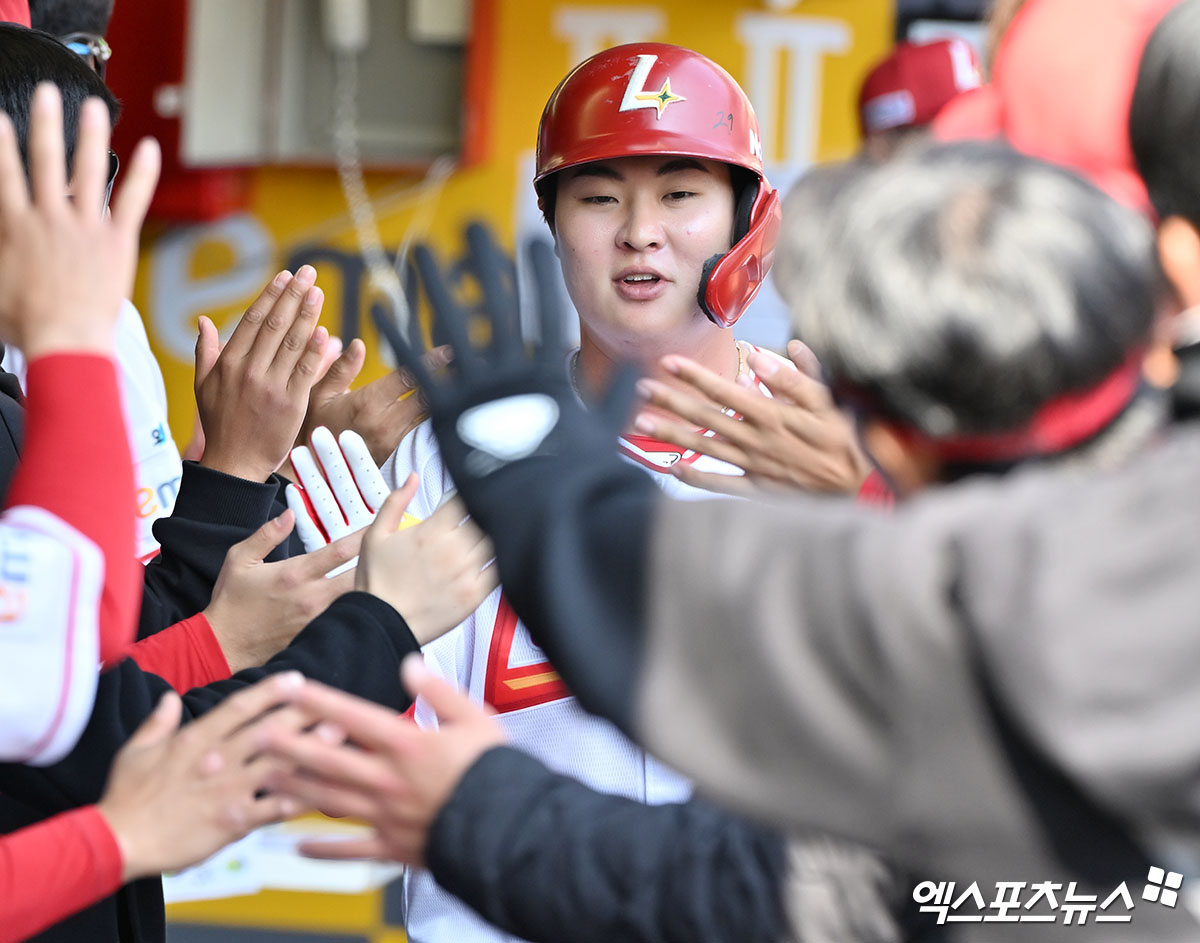 (엑스포츠뉴스 인천, 김한준 기자) 20일 오후 인천SSG랜더스필드에서 열린 '2026 신한 SOL Bank KBO리그' LG 트윈스와 SSG 랜더스의 시범경기, 4회말 1사 1루 SSG 고명준이 투런 홈런을 날린 후 기뻐하고 있다.