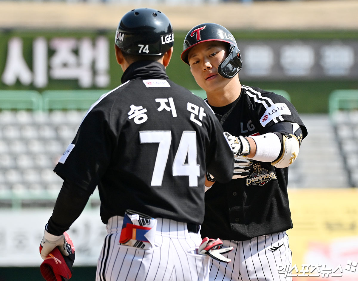 (엑스포츠뉴스 인천, 김한준 기자) 20일 오후 인천SSG랜더스필드에서 열린 '2026 신한 SOL Bank KBO리그' LG 트윈스와 SSG 랜더스의 시범경기, 5회초 무사 1,3루 LG 이주헌이 1타점 적시타를 날리고 있다.