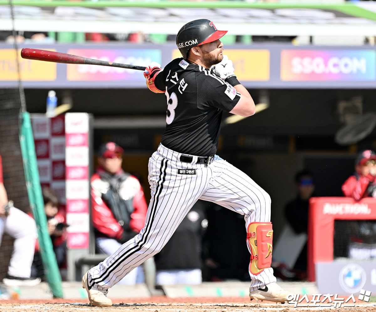 (엑스포츠뉴스 인천, 김한준 기자) 20일 오후 인천SSG랜더스필드에서 열린 '2026 신한 SOL Bank KBO리그' LG 트윈스와 SSG 랜더스의 시범경기, 5회초 1사 만루 LG 오스틴이 2타점 2루타를 날리고 있다.