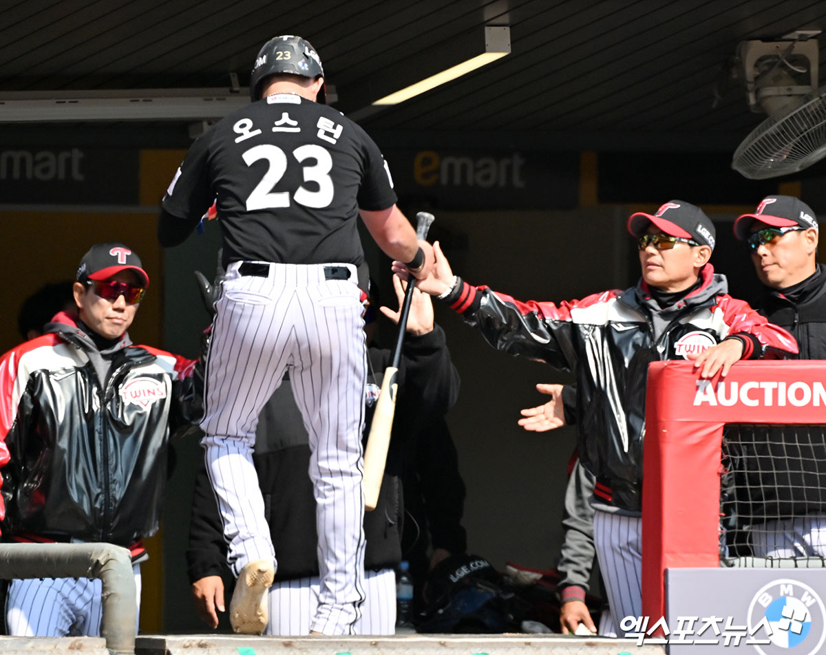 (엑스포츠뉴스 인천, 김한준 기자) 20일 오후 인천SSG랜더스필드에서 열린 '2026 신한 SOL Bank KBO리그' LG 트윈스와 SSG 랜더스의 시범경기, 5회초 2사 3루 LG 오스틴이 박동원의 1타점 적시타때 득점에 성공하고 있다.