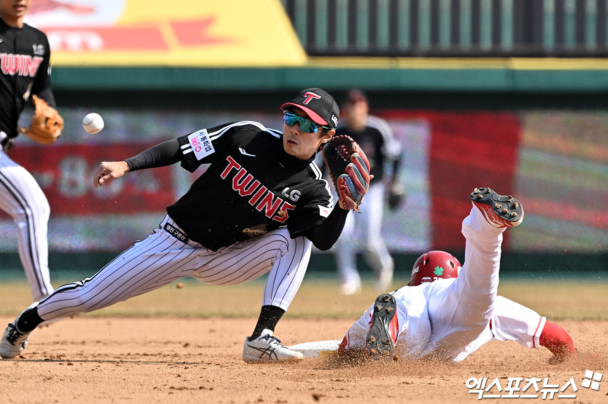 (엑스포츠뉴스 인천, 김한준 기자) 20일 오후 인천SSG랜더스필드에서 열린 '2026 신한 SOL Bank KBO리그' LG 트윈스와 SSG 랜더스의 시범경기, 5회말 1사 1,3루 SSG 오태곤이 2루 도루를 시도하고 있다.