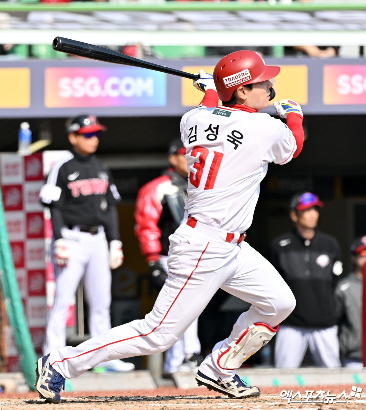 (엑스포츠뉴스 인천, 김한준 기자) 20일 오후 인천SSG랜더스필드에서 열린 '2026 신한 SOL Bank KBO리그' LG 트윈스와 SSG 랜더스의 시범경기, 5회말 2사 2,3루 SSG 김성욱이 2타점 적시타를 날리고 있다.