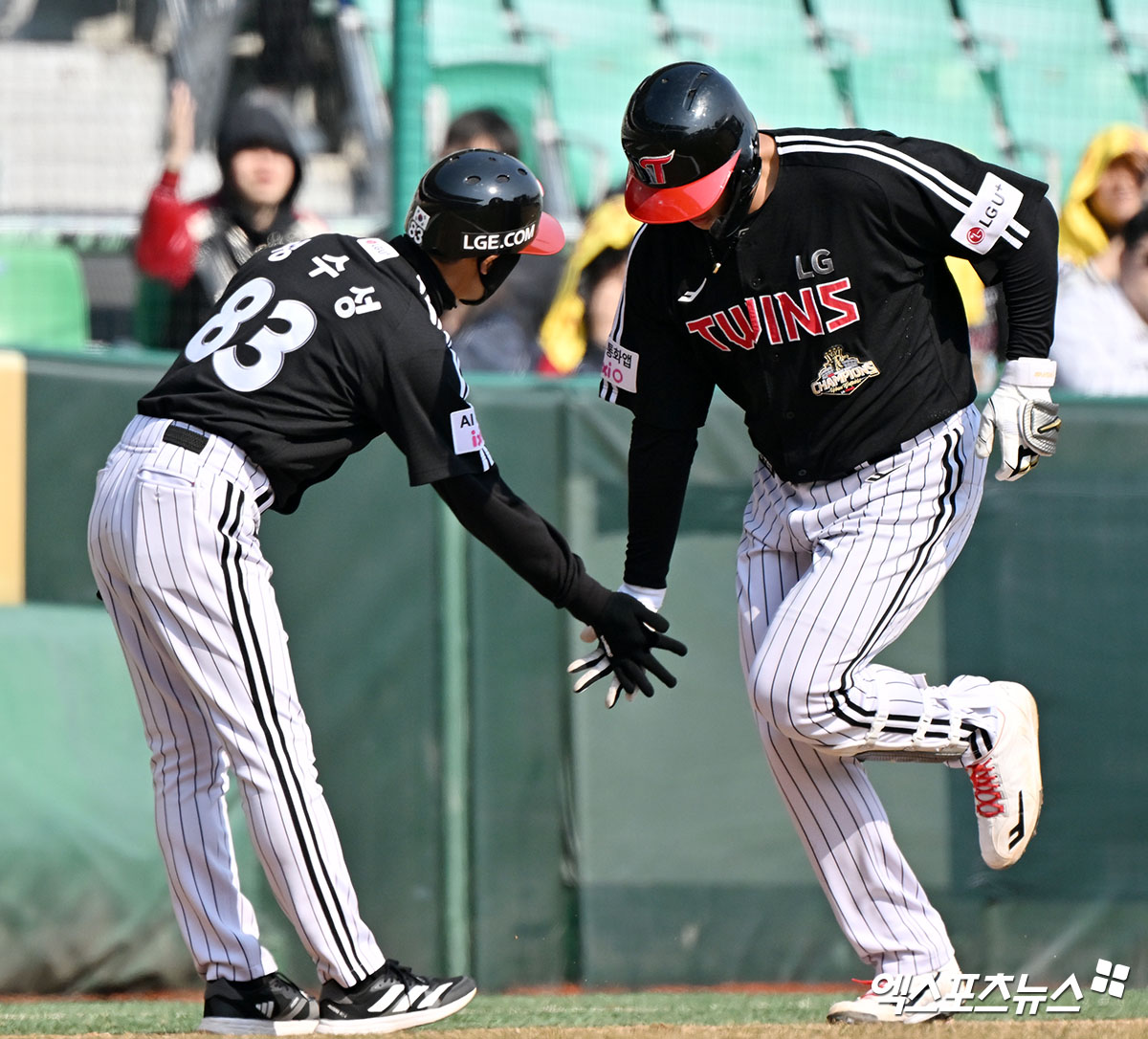 (엑스포츠뉴스 인천, 김한준 기자) 20일 오후 인천SSG랜더스필드에서 열린 '2026 신한 SOL Bank KBO리그' LG 트윈스와 SSG 랜더스의 시범경기, 6회초 LG 이재원이 솔로 홈런을 날린 후 그라운드를 돌고 있다.