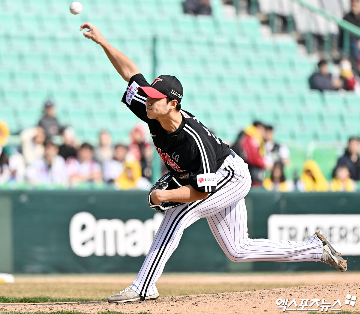 (엑스포츠뉴스 인천, 김한준 기자) 20일 오후 인천SSG랜더스필드에서 열린 '2026 신한 SOL Bank KBO리그' LG 트윈스와 SSG 랜더스의 시범경기, 6회말 LG 백승현이 공을 힘차게 던지고 있다.