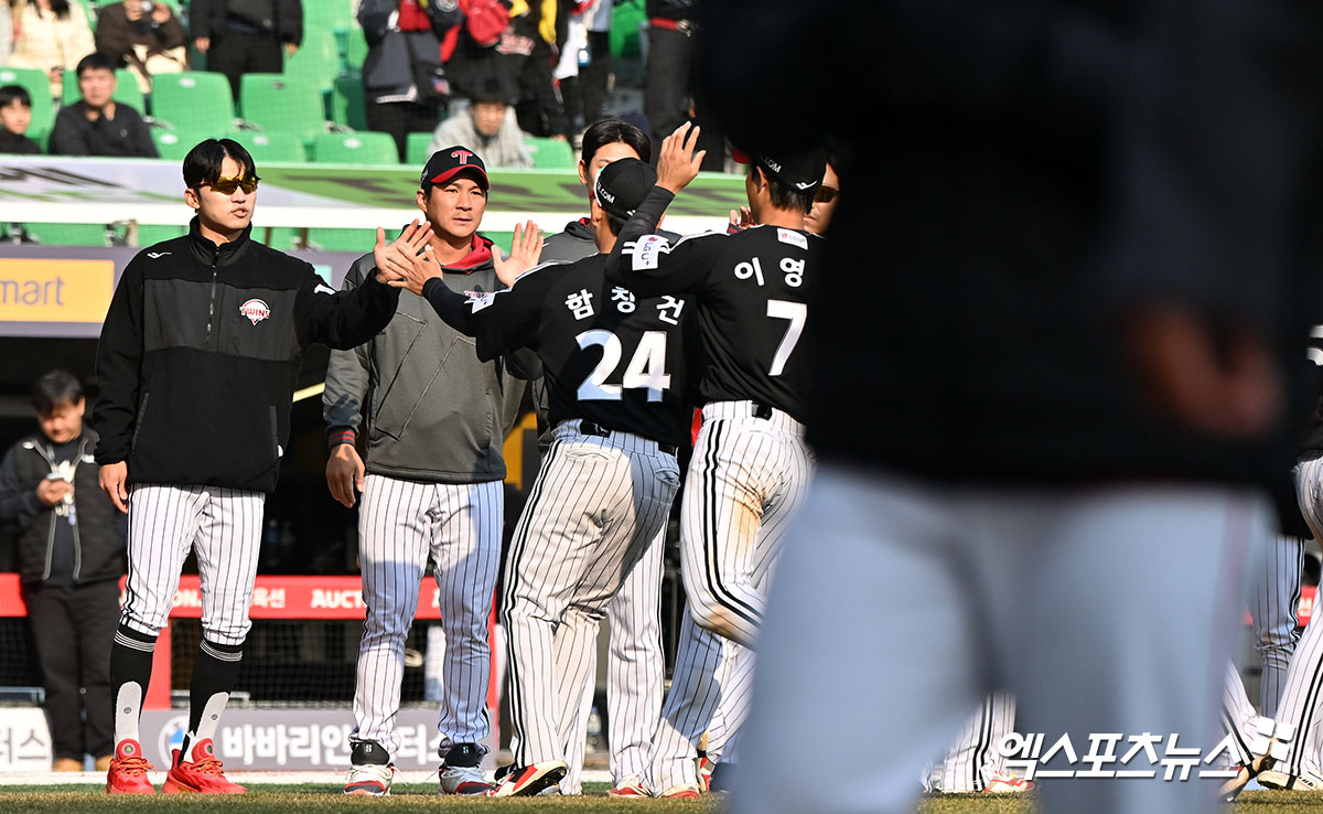 이날 경기에서 승리한 LG 선수들이 기뻐하고 있다.